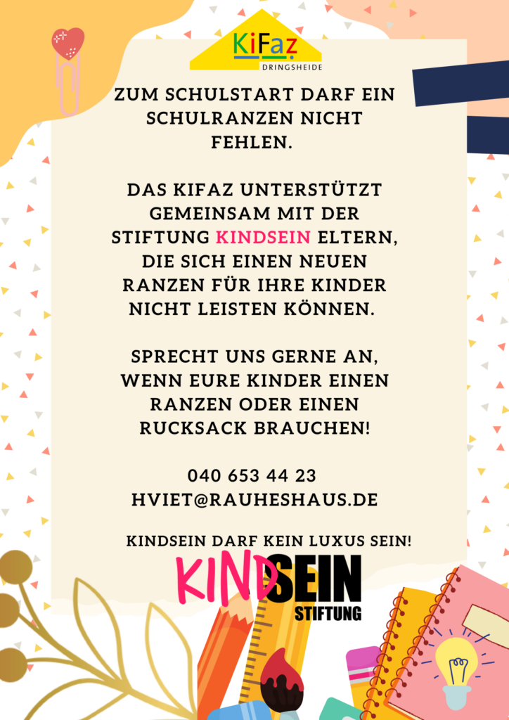 Zum Schulstart darf ein Schulranzen nicht fehlen. Unser Kooperationspartner KiFaz Dringsheide macht auf ein Unterstützungsangebot aufmerksam: